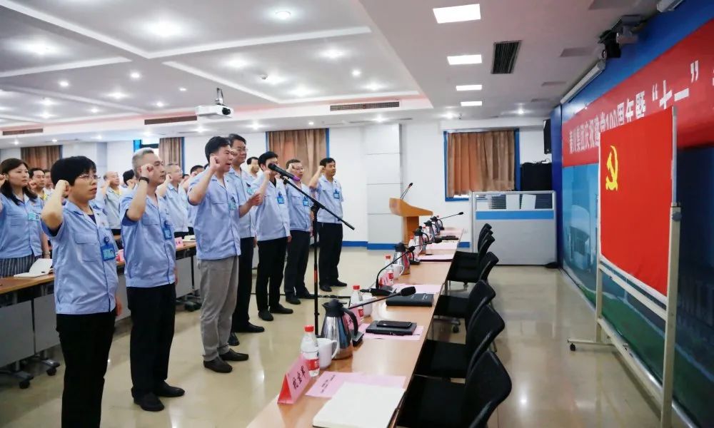 面對鮮紅的中國共產(chǎn)黨黨旗,嚴鑒鉑書記帶領班子成員、新發(fā)展黨員、全體參會黨員握舉右拳,鄭重宣誓,重溫入黨誓詞。