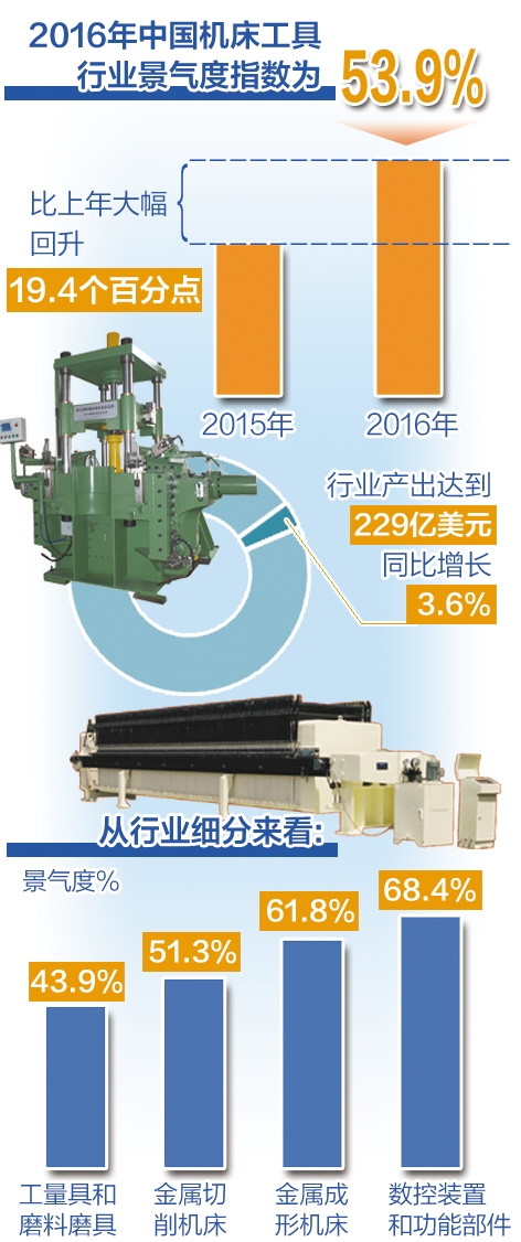 中國機(jī)床工具工業(yè)協(xié)會最新數(shù)據(jù)顯示,2016年中國機(jī)床工具行業(yè)景氣度指數(shù)為53.9%,比上年大幅回升19.4個(gè)百分點(diǎn),反映出行業(yè)運(yùn)行呈現(xiàn)回升態(tài)勢。